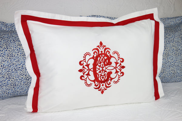 1) Set of 2 Monogrammed white 100% cotton pillow shams with the red border - $180